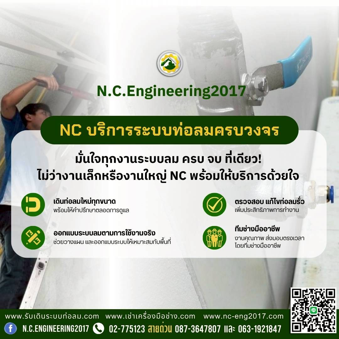 NC Engineering 2017 ให้บริการงานระบบท่อลมแบบครบวงจร ตั้งแต่การออกแบบระบบลม การเดินท่อใหม่ การตรวจสอบแรงดันลม ไปจนถึงการแก้ไขปัญหาท่อลมรั่วซึม ดูแลโดยทีมช่างที่มีประสบการณ์ตรงงานโรงงานอุตสาหกรรม ช่วยให้ระบบลมทำงานได้เต็มประสิทธิภาพและปลอดภัยในการใช้งาน