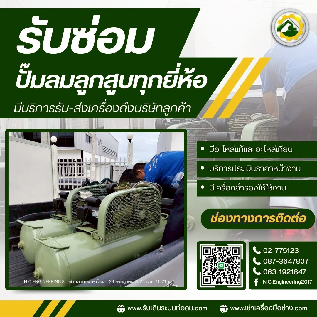 NC Engineering (2017) Co.,Ltd. ให้บริการ รับซ่อมปั๊มลมลูกสูบทุกยี่ห้อ สำหรับโรงงานอุตสาหกรรม อาคาร และธุรกิจที่ต้องใช้ลมอัดอย่างต่อเนื่อง โดยทีมช่างและวิศวกรที่มีประสบการณ์ตรง