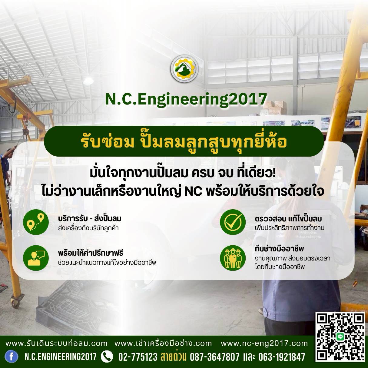 มั่นใจทุกงานปั๊มลม ครบ จบ ที่เดียว ไม่ว่างานเล็กหรืองานใหญ่ N.C. Engineering 2017 พร้อมดูแลตั้งแต่ตรวจเช็ก แก้ไข ไปจนถึงทดสอบการใช้งานจริง เพื่อให้ปั๊มลมกลับมาทำงานเต็มประสิทธิภาพ ลดปัญหาหยุดไลน์การผลิต