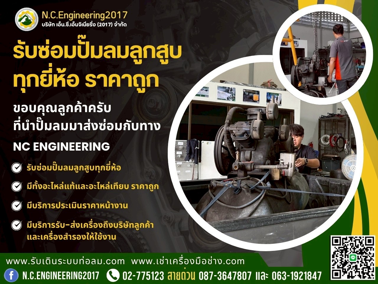 N.C.Engineering2017 พร้อมให้บริการรับซ่อมปั๊มลมลูกสูบทุกยี่ห้อ ทุกขนาด ทั้งงานโรงงาน อุตสาหกรรม และธุรกิจทั่วไป ด้วยทีมช่างผู้ชำนาญงานโดยตรง